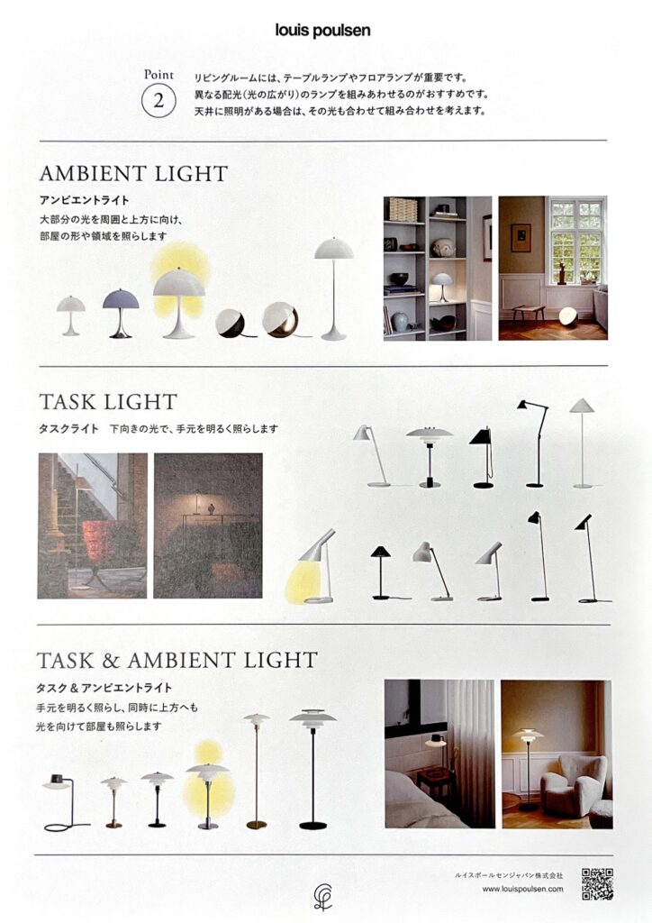 主にはタスク照明とアンビエント照明を使い分けつつ、空間としてはどちらもあることでメリハリある照明空間が作れるということでした。
