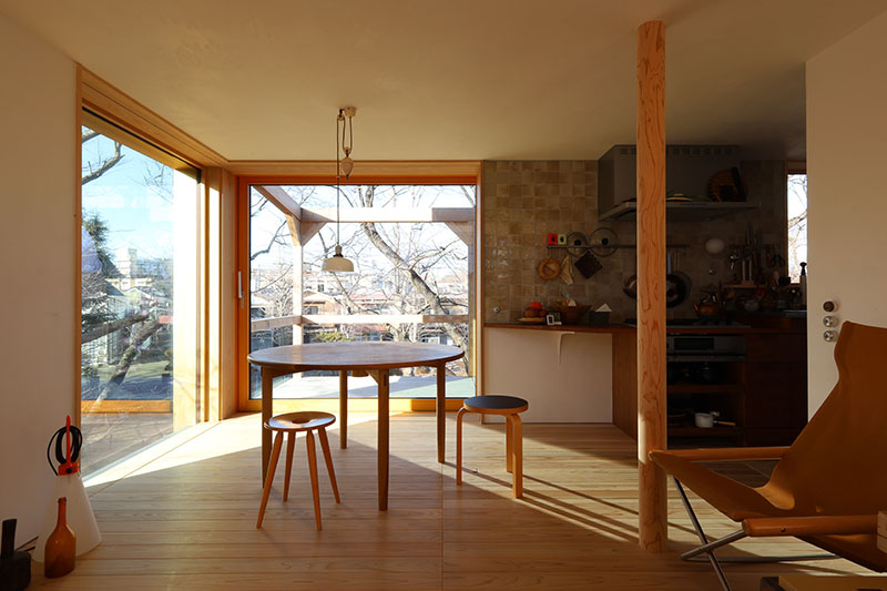 2階リビングから景色を取り込む木製フルオープンサッシ